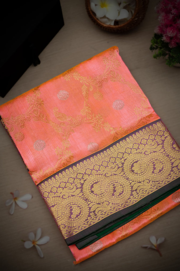 Mandir Pink & Coral Venkatagiri Buttis Saree