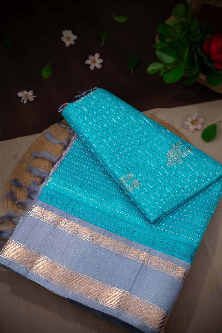 Mandir Sea Blue & Grey Kuppadam Checks Saree