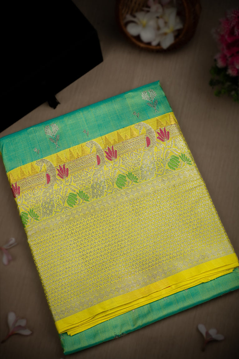Mandir Sea Blue & Lemon Yellow Venkatagiri Buttis Saree