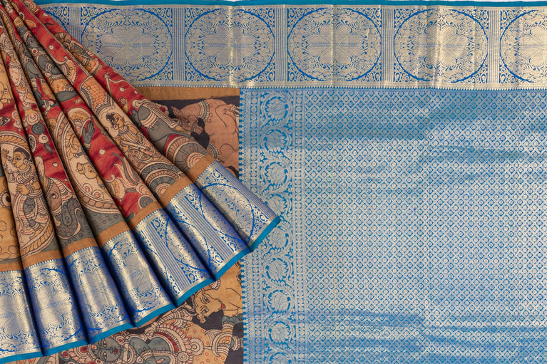 Mandir Snuff & Peacock Blue Kanchi Kalamkari Print Saree