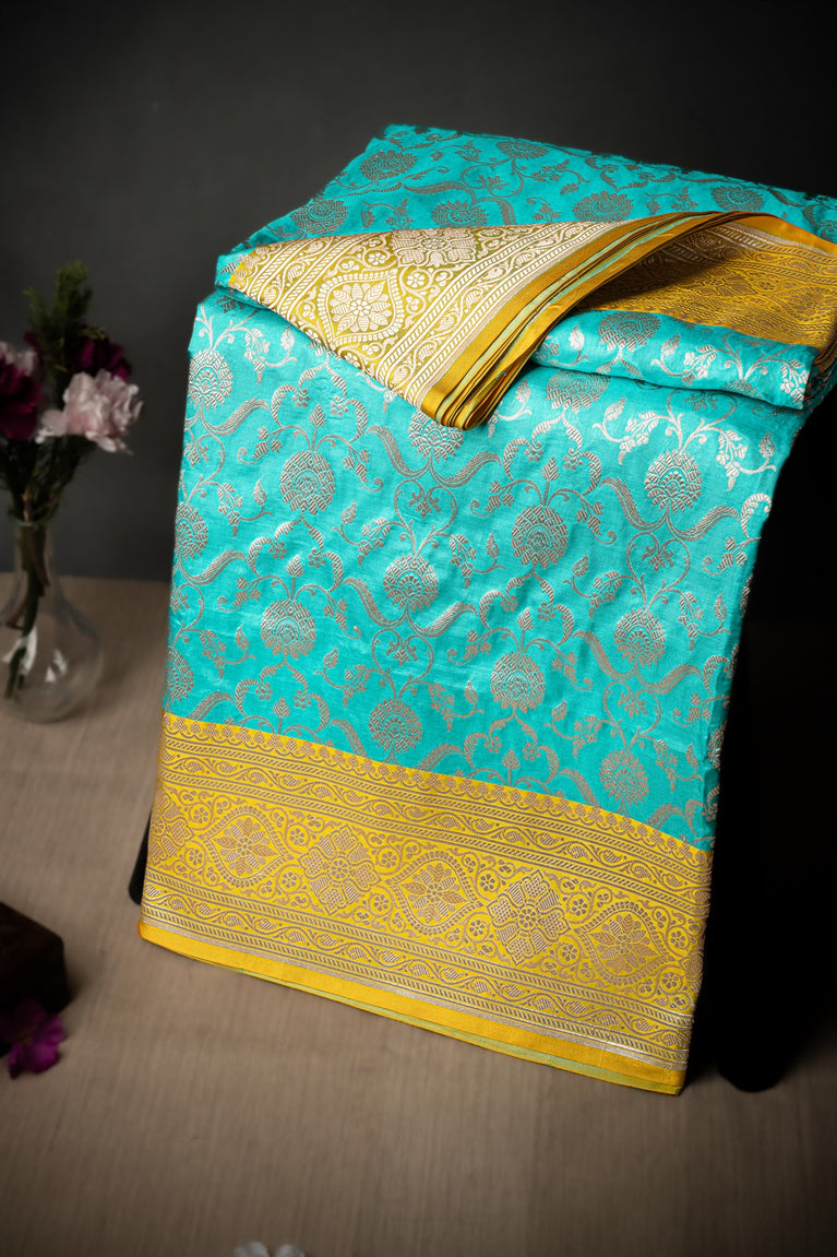 Mandir Sea Blue & Yellow Banarasi Jaal Saree