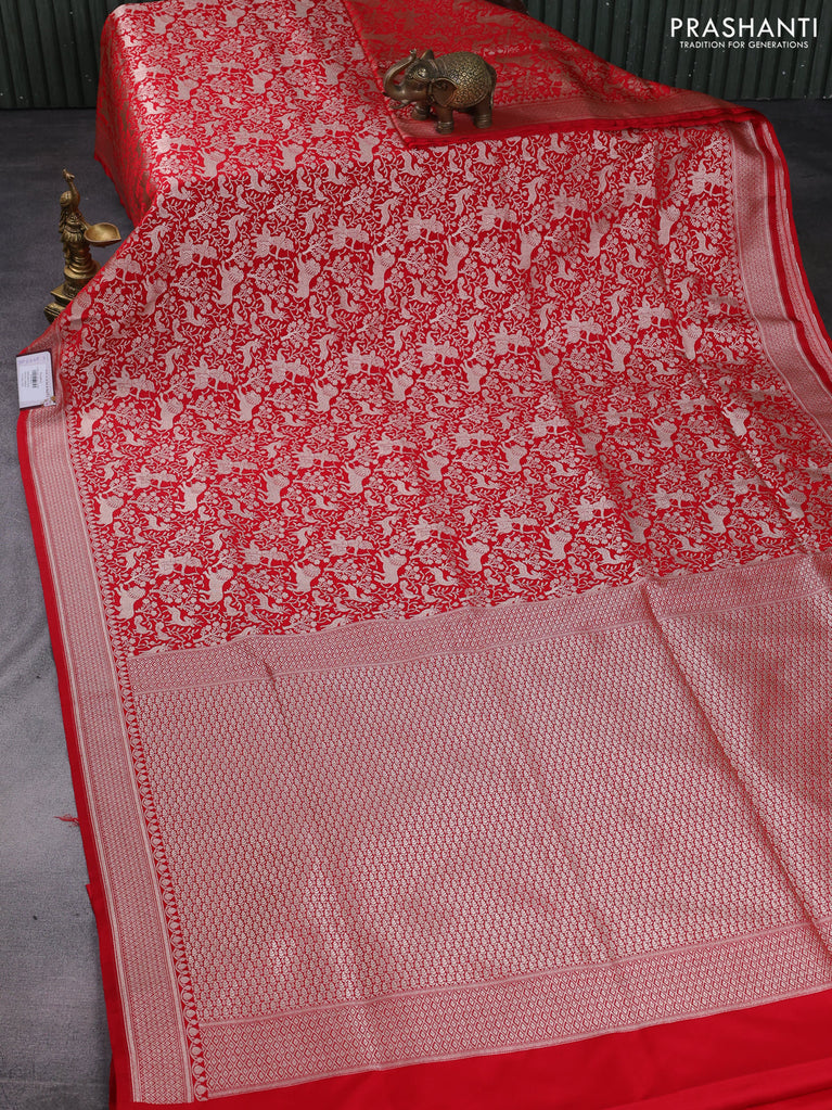 Banarasi semi katan saree red with silver & gold zari woven buttas and rich zari woven border