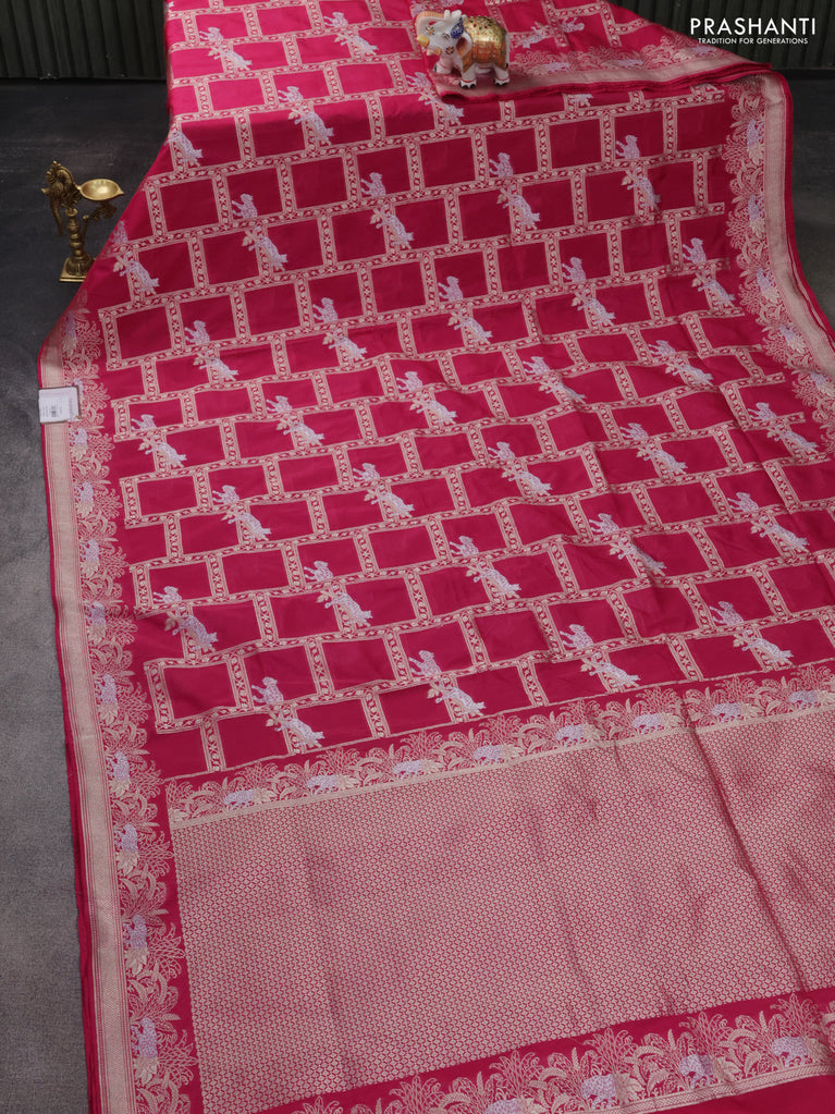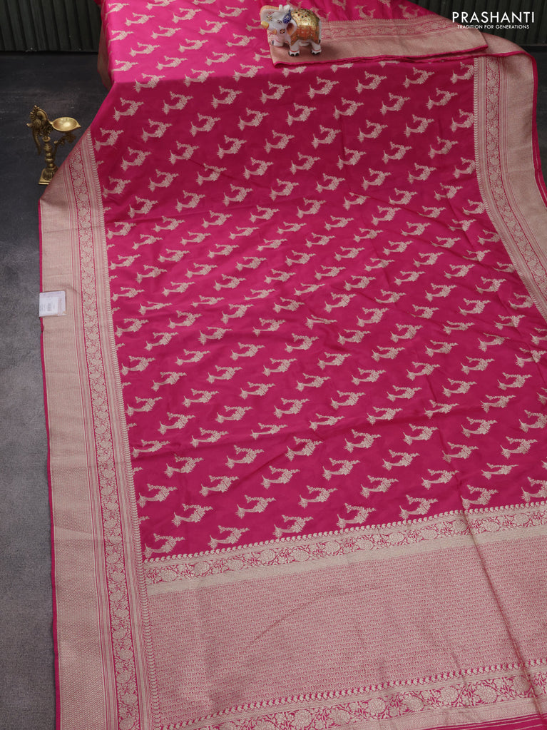 Banarasi semi katan silk saree pink with allover silver & gold zari weaves and deer design zari woven border