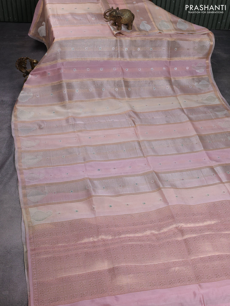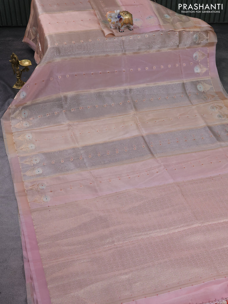 Banarasi tissue semi silk saree pastel peach pink with zari weaves & buttas and floral zari woven butta border