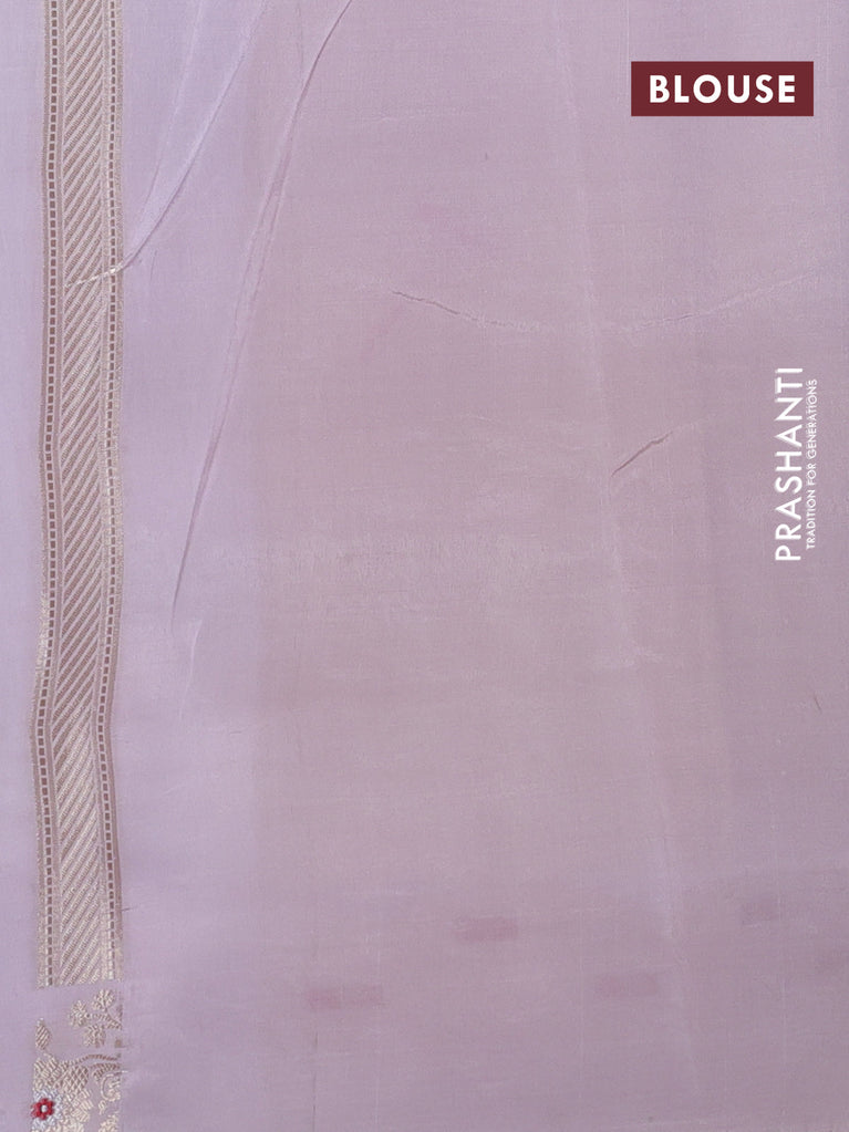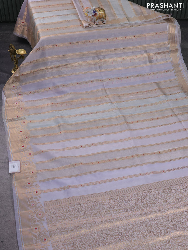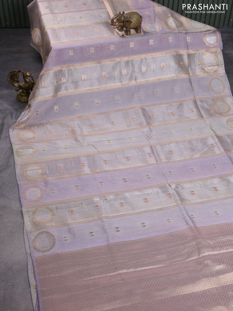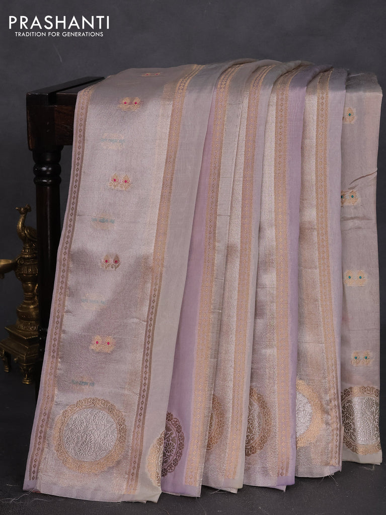 Banarasi tissue semi silk saree pastel grey and mild lavnder with allover zari weaves and zari woven floral border