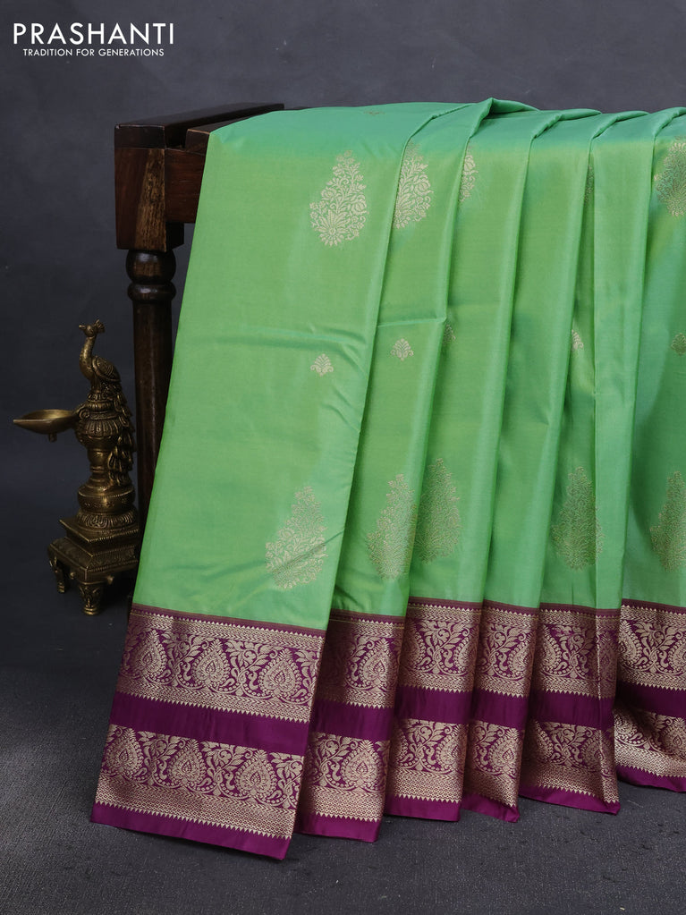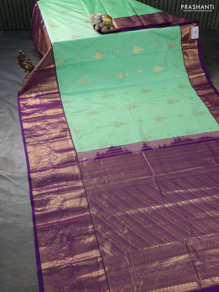 Bangalori silk saree pastel green and deep purple with zari woven buttas and zari woven border