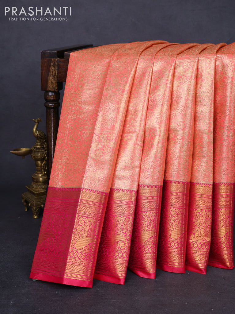 Bangalori tissue silk saree peach pink and pink with allover zari woven brocade weaves and long zari woven border