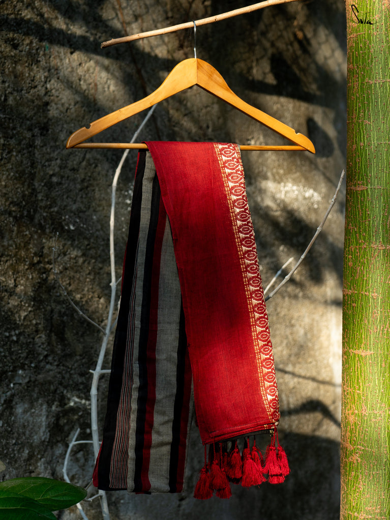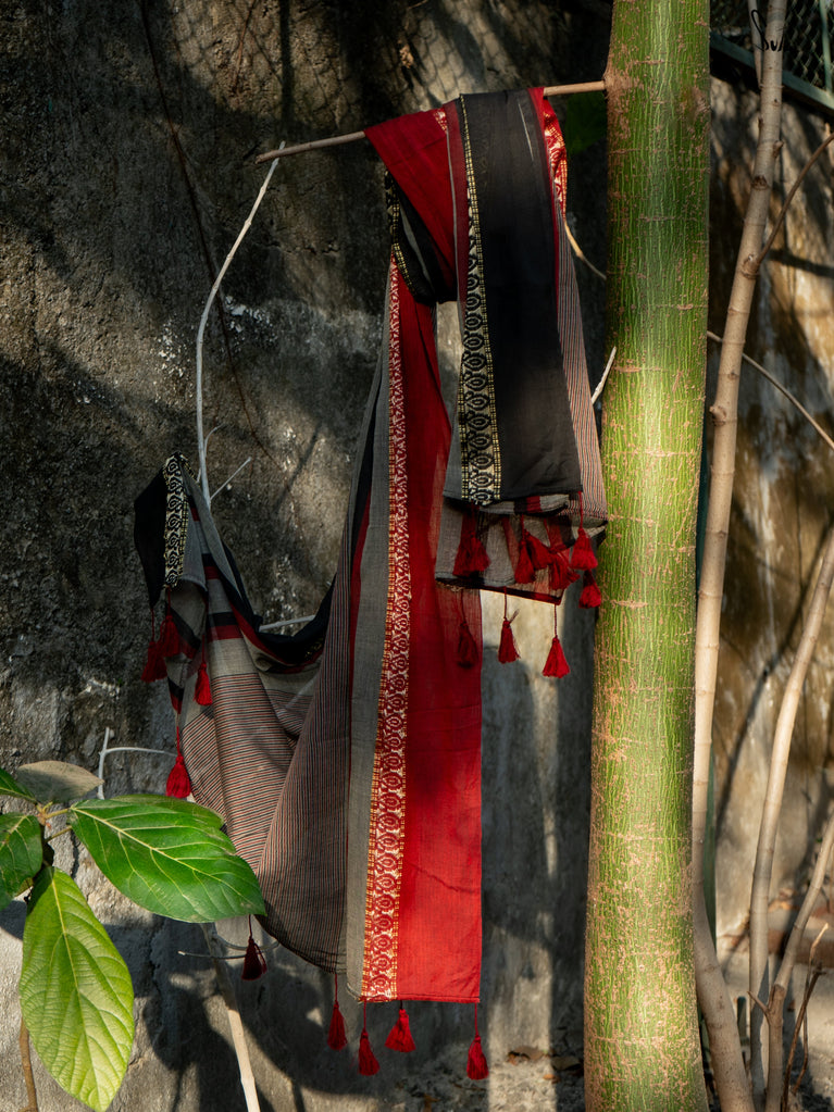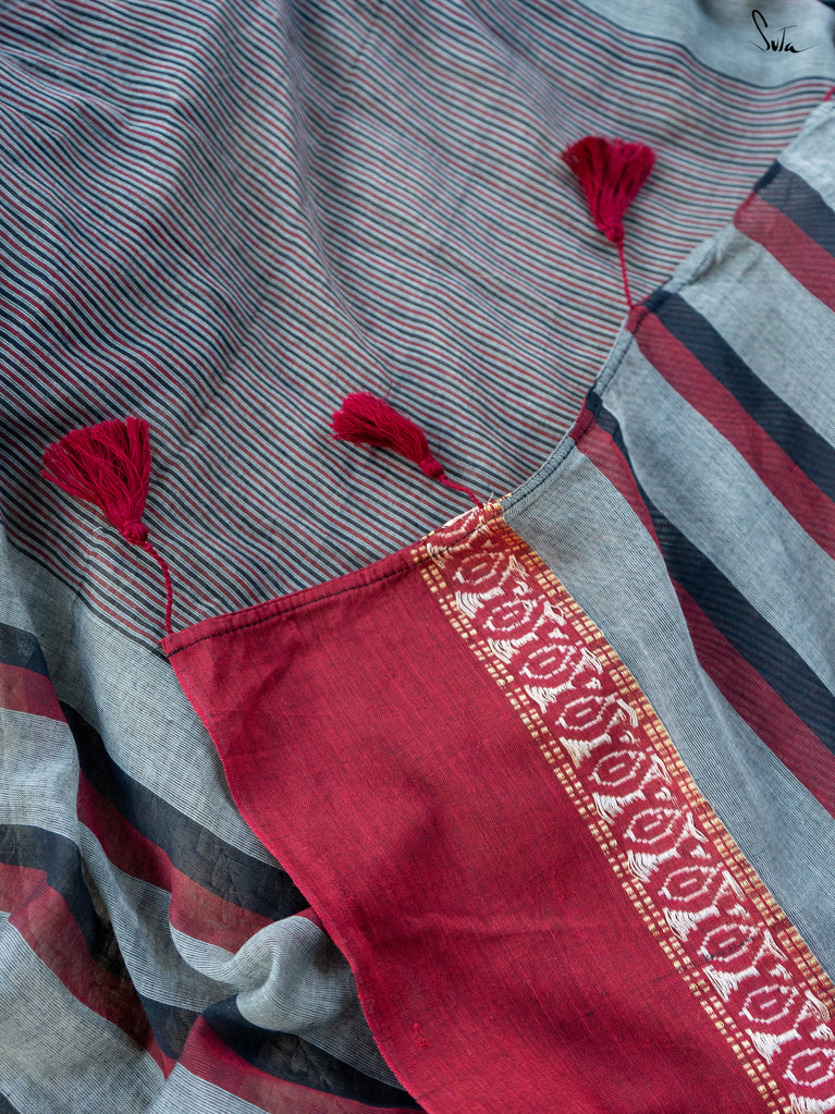 Dive into your wildest dreams in our beige with a thin lavender and red border saree. The comfort of mul-mul cotton will win your heart.