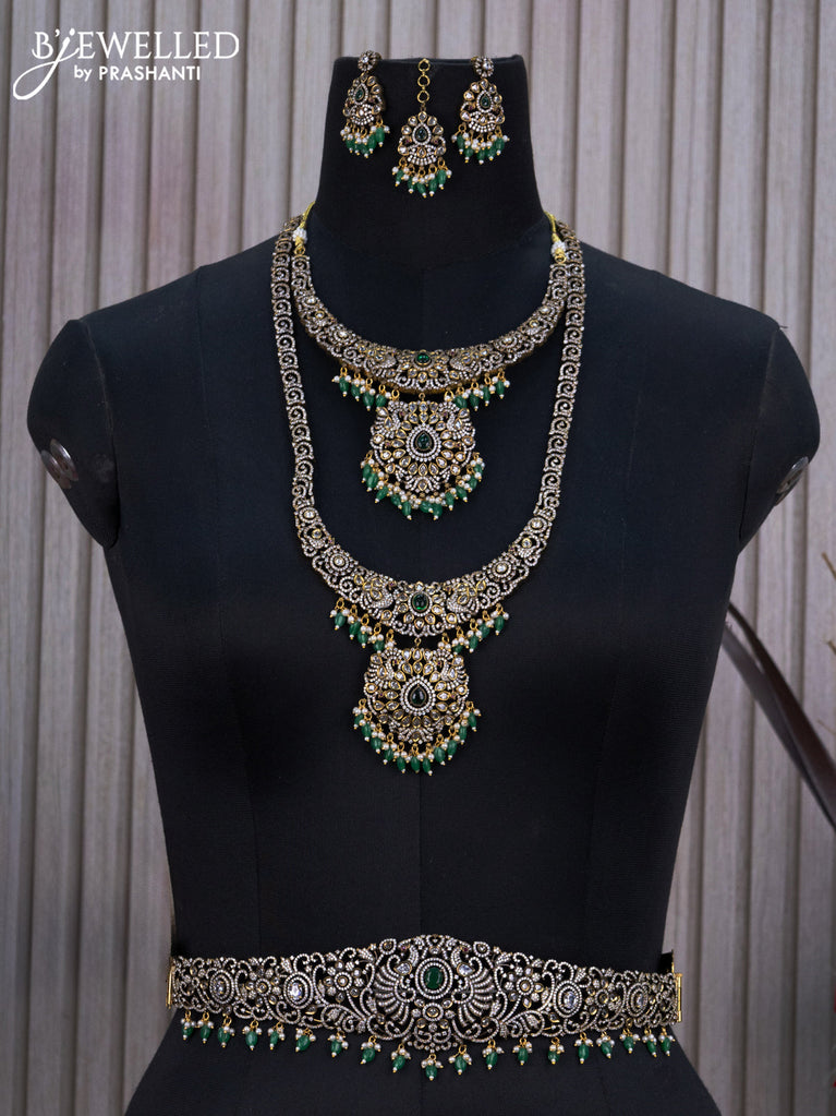 Bridal set with emerald & cz stones and beads hangings in victorian finish