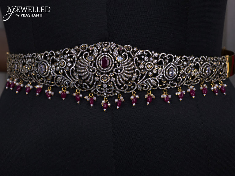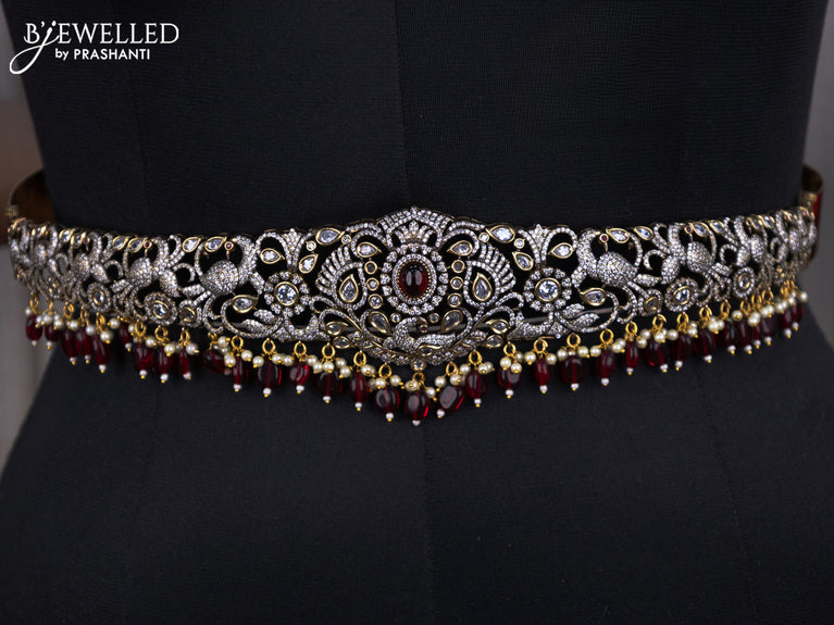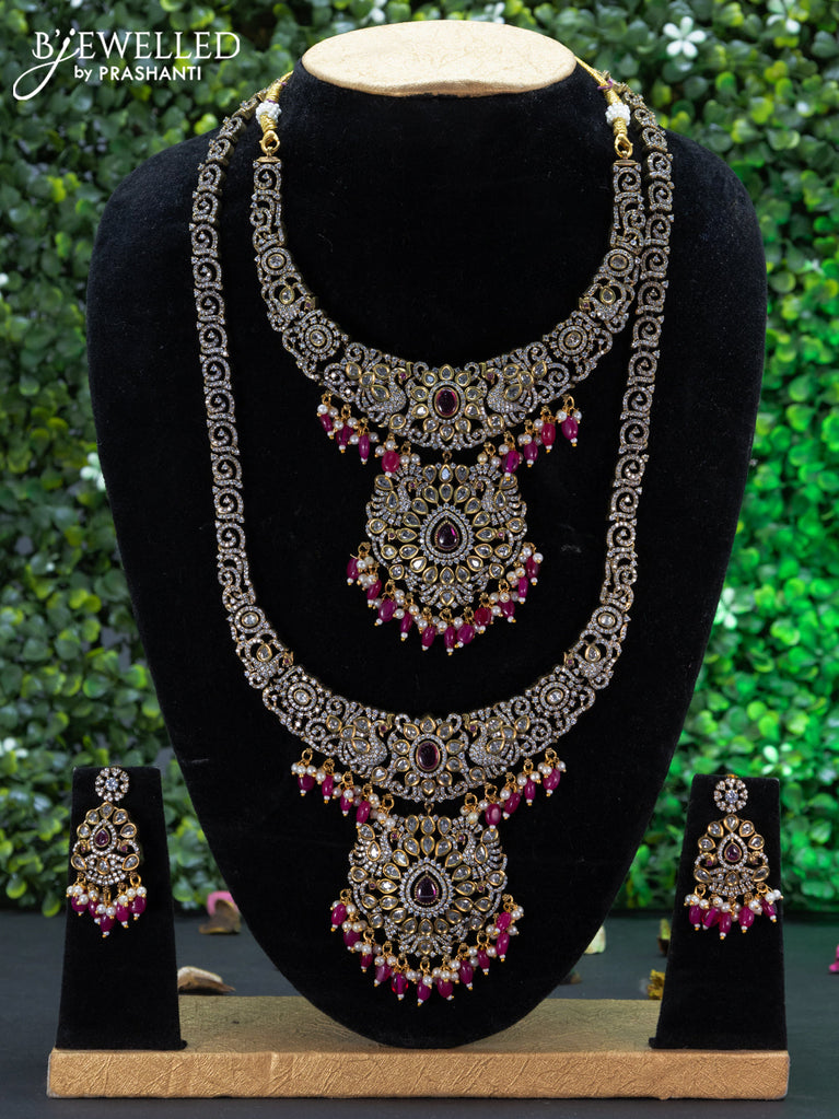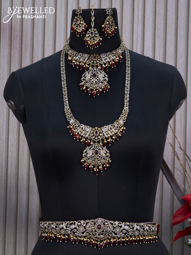 Bridal set peacock design with ruby & cz stones and beads hangings in victorian finish