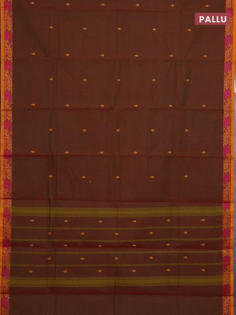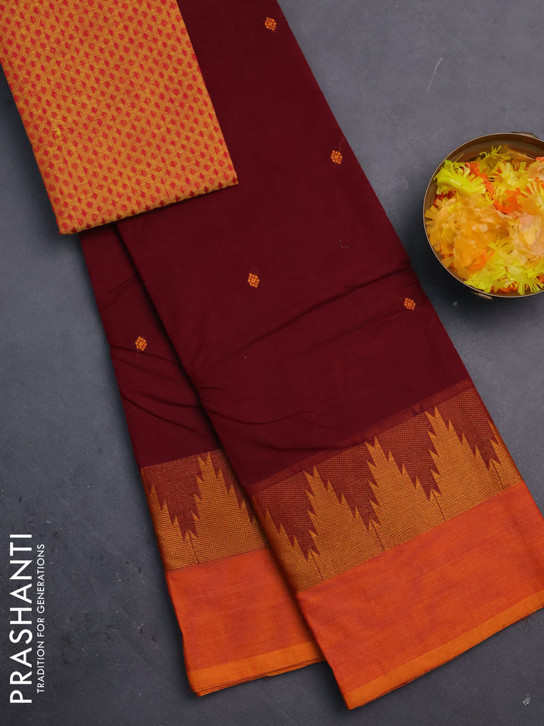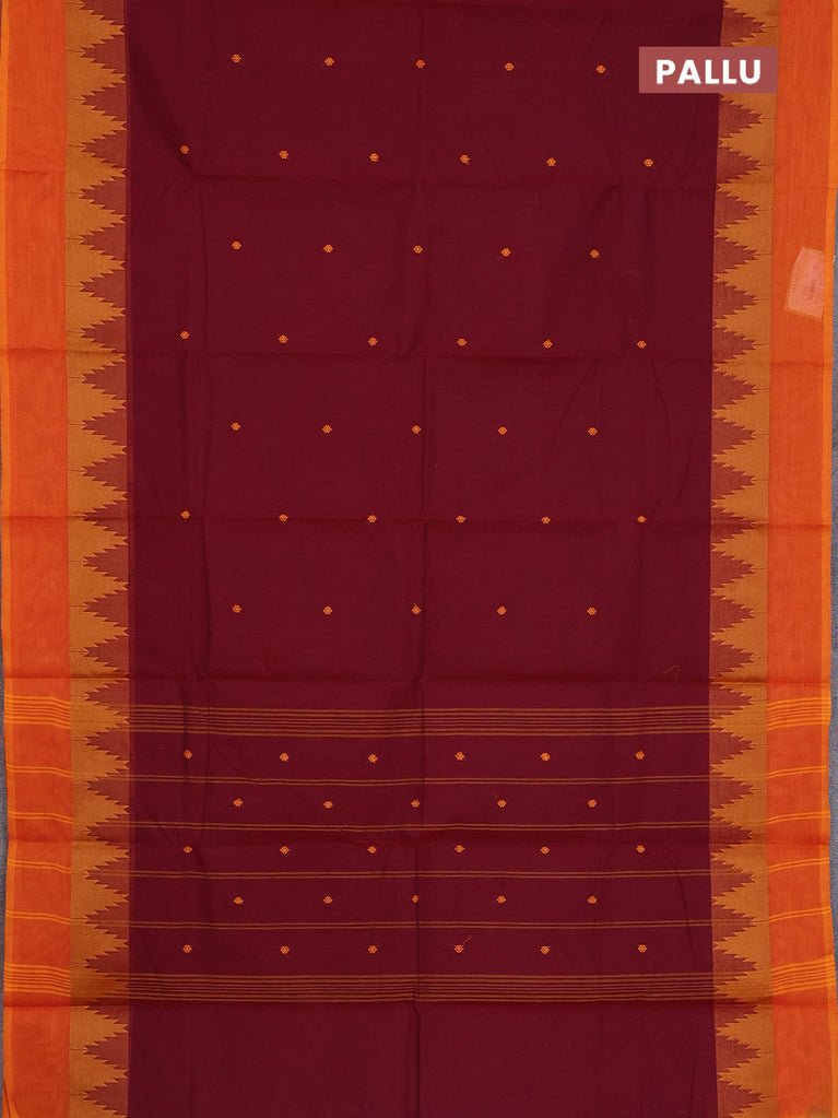 Chettinad cotton saree maroon and orange with thread woven buttas and temple thread woven simple border
