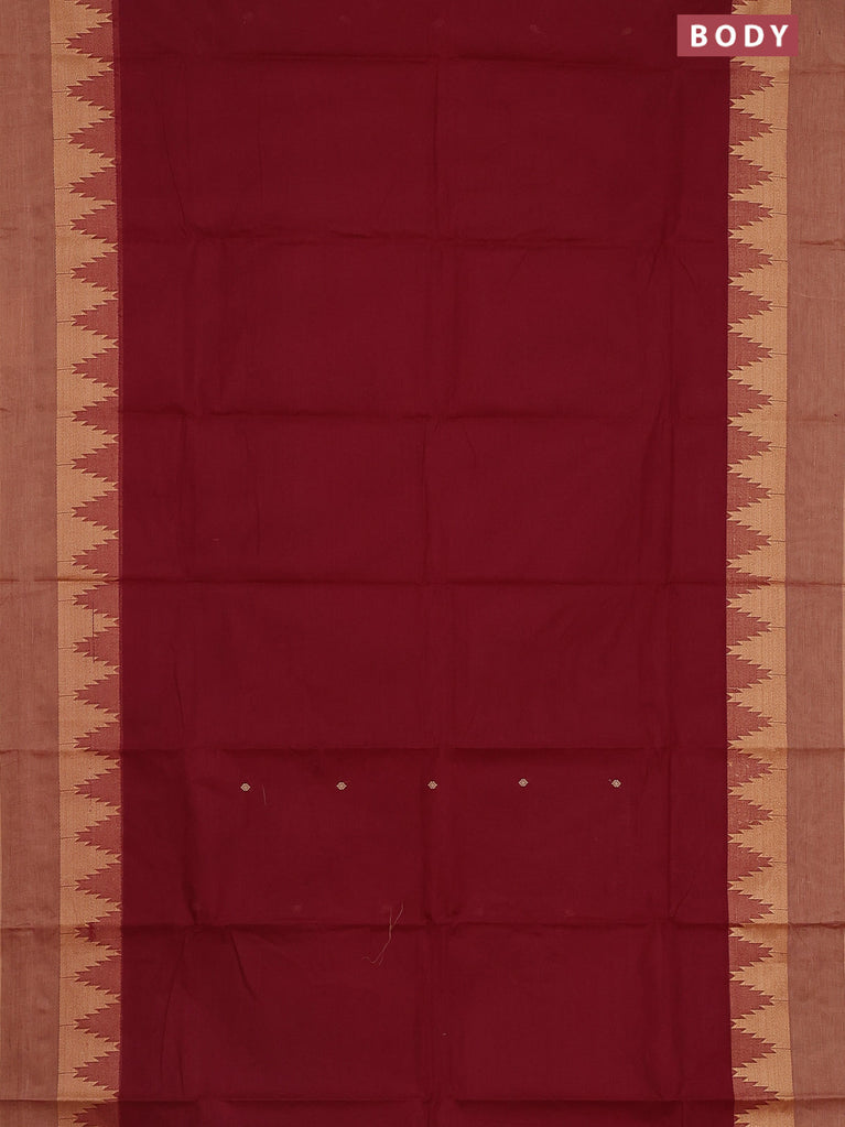 Chettinad cotton saree maroon and sandal with thread woven buttas and temple thread woven simple border