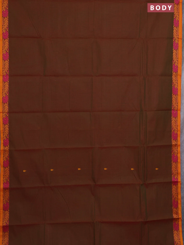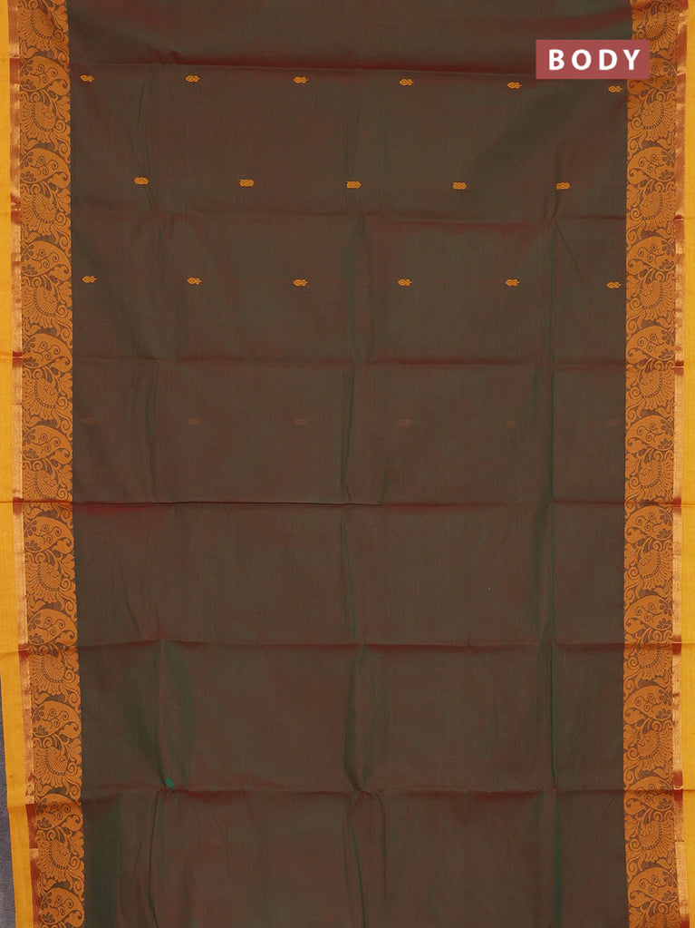 Chettinad cotton saree manthulir green and mustard shade with thread woven buttas and temple design zari border