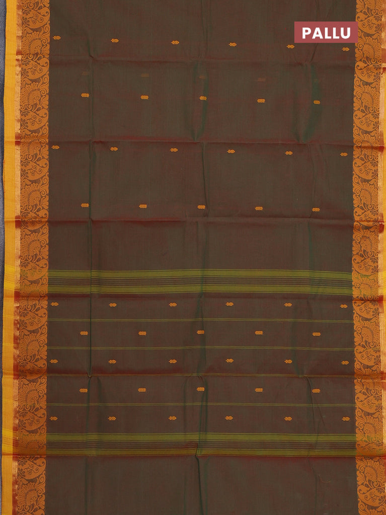 Chettinad cotton saree manthulir green and mustard yellow with thread woven buttas and thread woven border