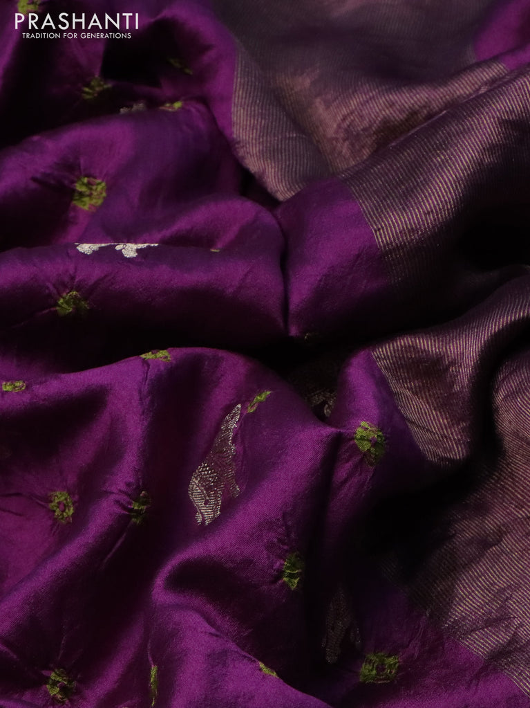 Chiniya silk saree purple and mehendi green with allover zari buttas & bandhini prints in borderless style
