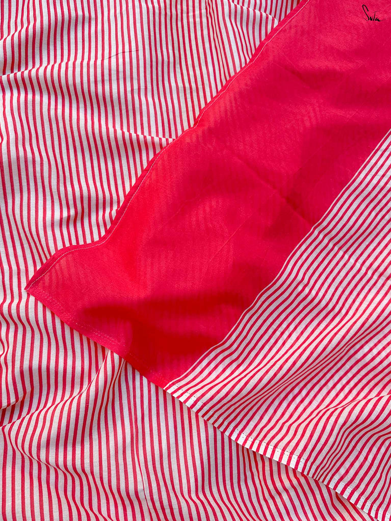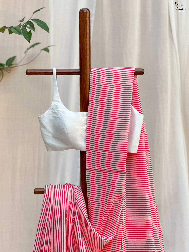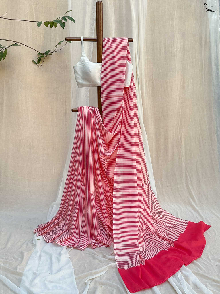 A pink and orange striped cotton saree that radiates warmth and playfulness, finished with a contrast green jacquard border that makes the whole piece pop. What makes it precious is its easy versatility — light enough for everyday wear yet striking enough to turn heads on festive mornings. It’s that saree you’ll keep reaching for when you want effortless charm with a dash of boldness.