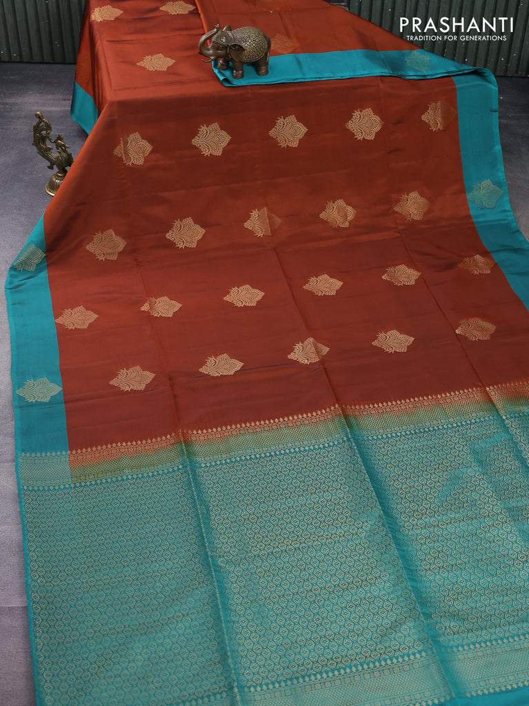 Kanchipuram soft silk saree rust shade and teal green with zari woven buttas and zari woven butta border