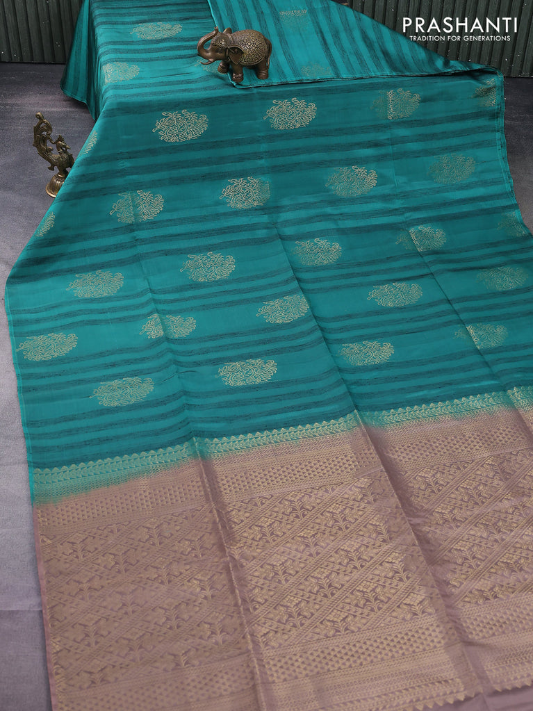 Kanchipuram soft silk saree teal green and pastel brown with allover zari stripe pattern and long rich zari woven border