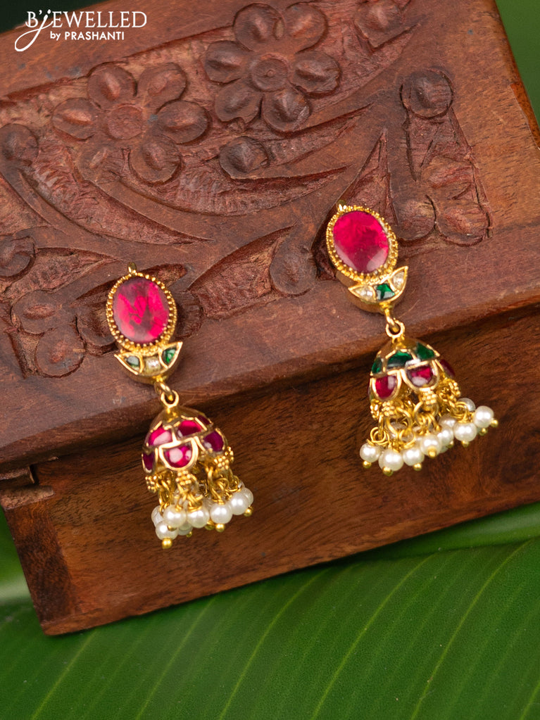 Antique screw type jhumka lakshmi design with pink jadau stones and golden beads hanging