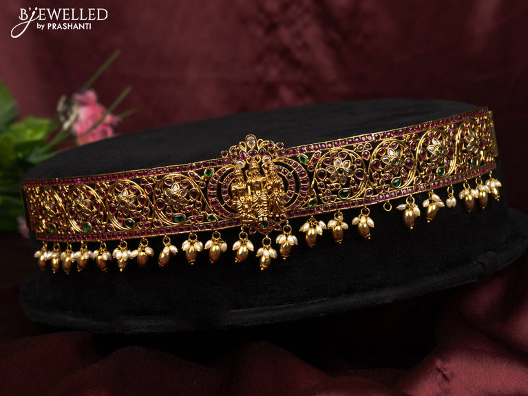 Antique self emboss hip belt lakshmi pendant with kemp & cz stones and pearl &beads hangings
