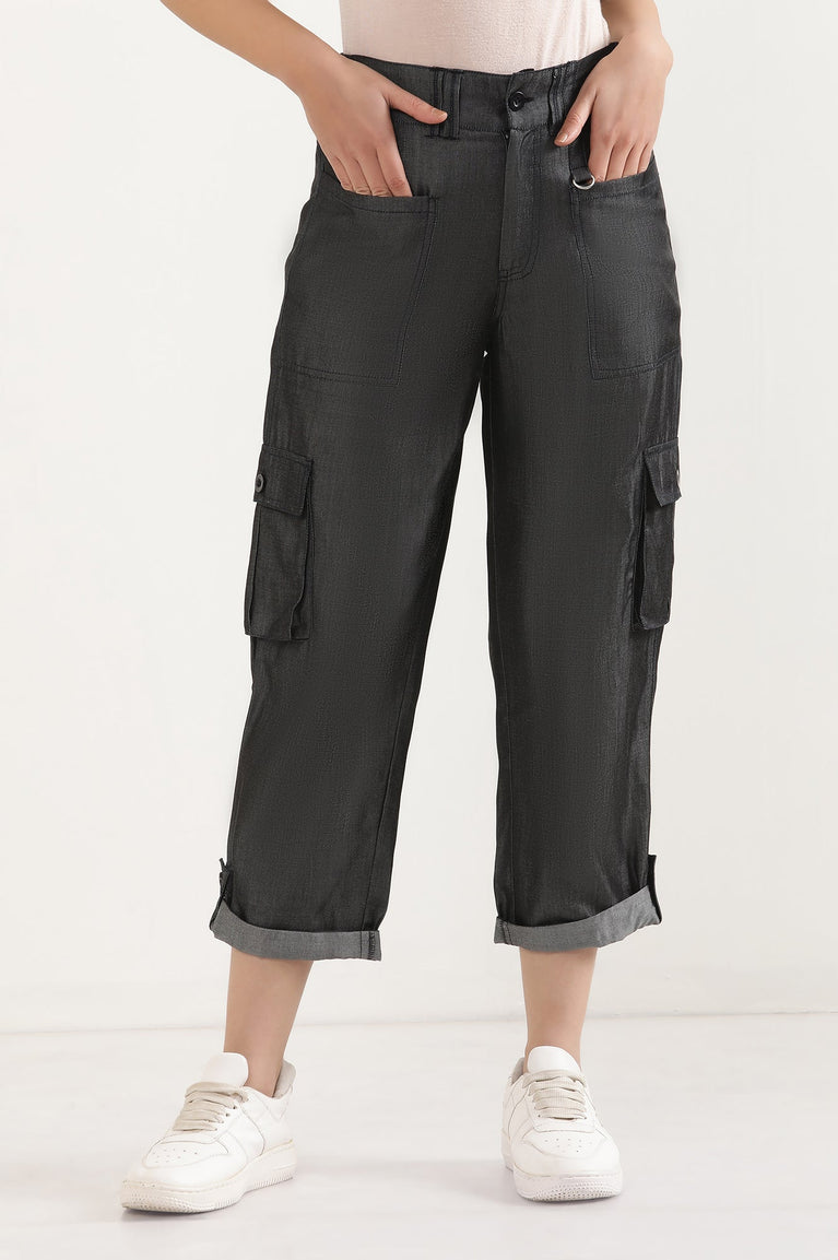 These cropped cargo are a must have for the season. These cargos have six functional pockets that enable you to carry your essentials with easy. Functional front opening and elasticized back wasit belt makes it easy to slip on and comfortable for long duration travel. the cropped ankle length can be rolled-up as per need and fashionable look.