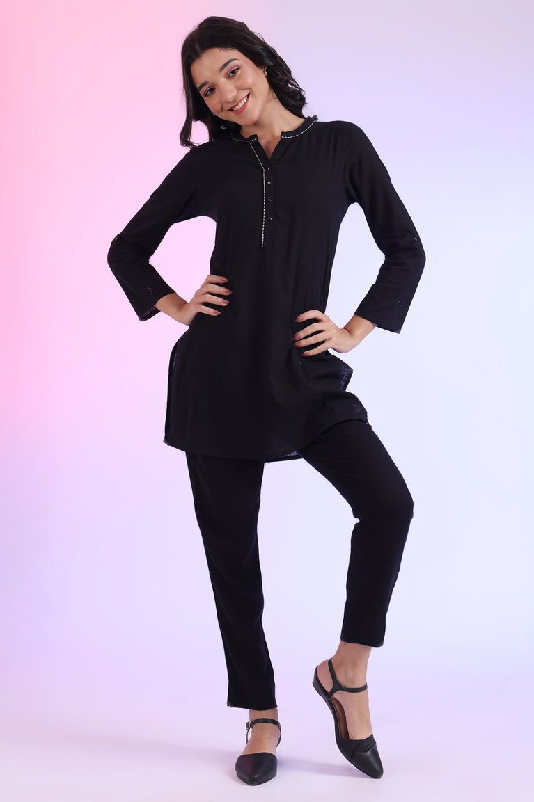 Some pieces speak in whispers, not shouts, and this is one of them. Crafted for the woman who finds power in simplicity, this stunning black kurta set for women is an ode to understated elegance. This perfectly coordinated ethnic co-ord set is fashioned from a breathable cotton slub fabric, offering a subtle texture and unparalleled comfort for all-day wear. Its straight silhouette glides effortlessly, creating a look that is both timeless and poised. This solid black cotton kurta set is a testament to minimalist ethnic wear.