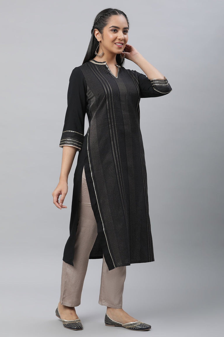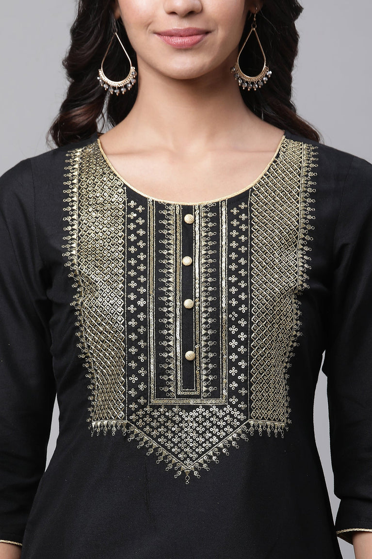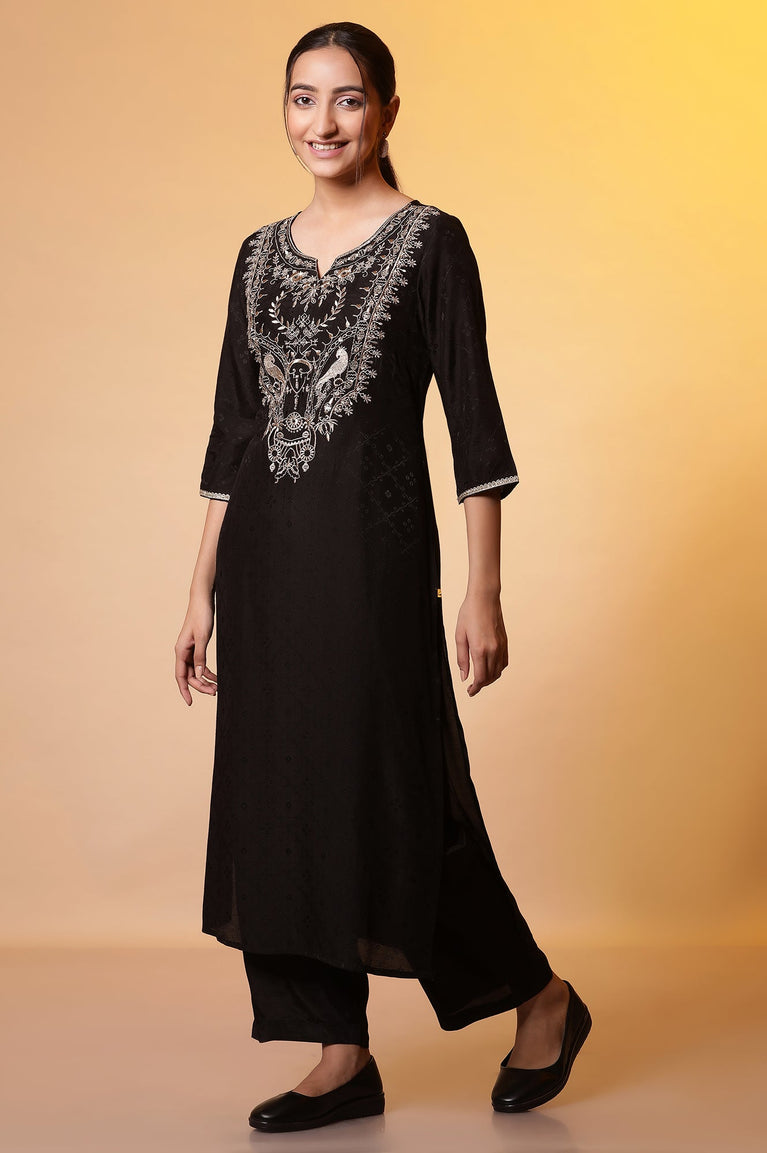 Black Zari Embroidered and Sequins Viscose Blend Straight Kurta and Palazzo Set