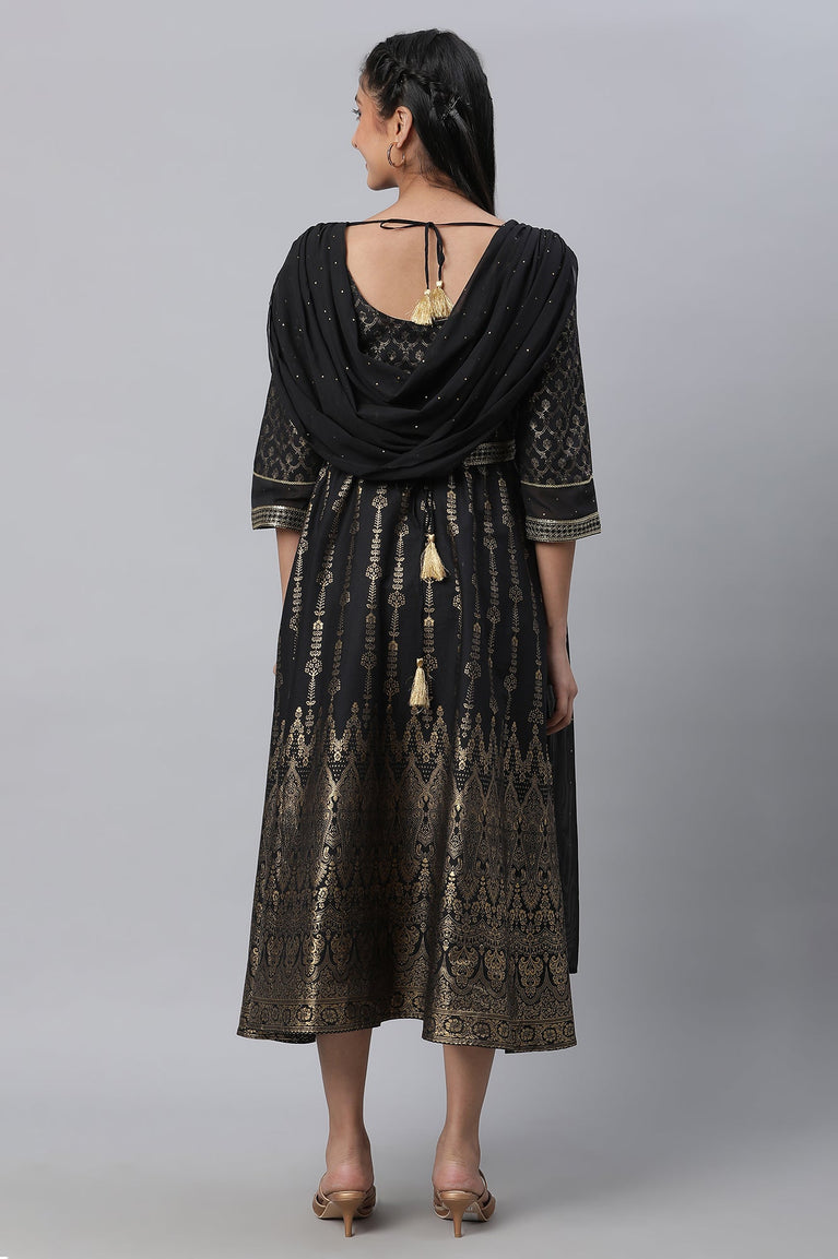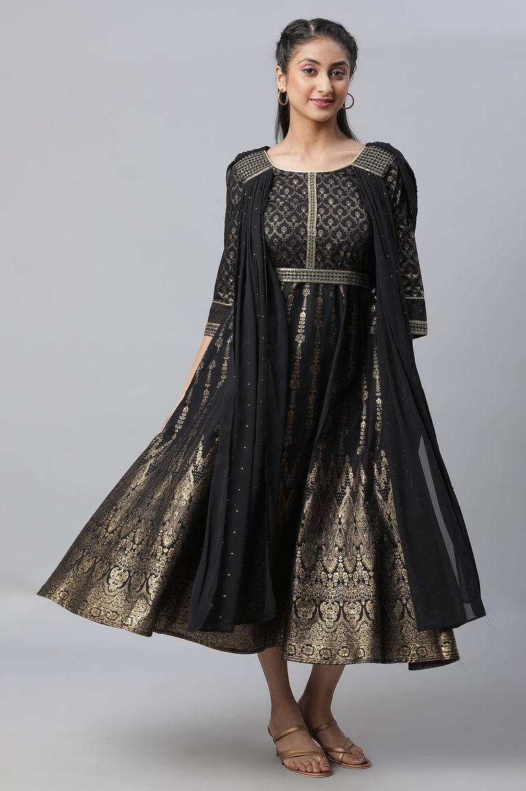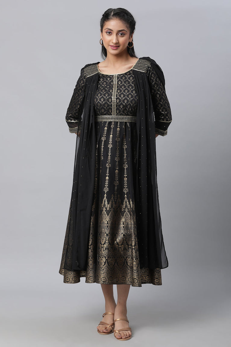 Black Zari Embroidered Festive Dress With Attached Drape