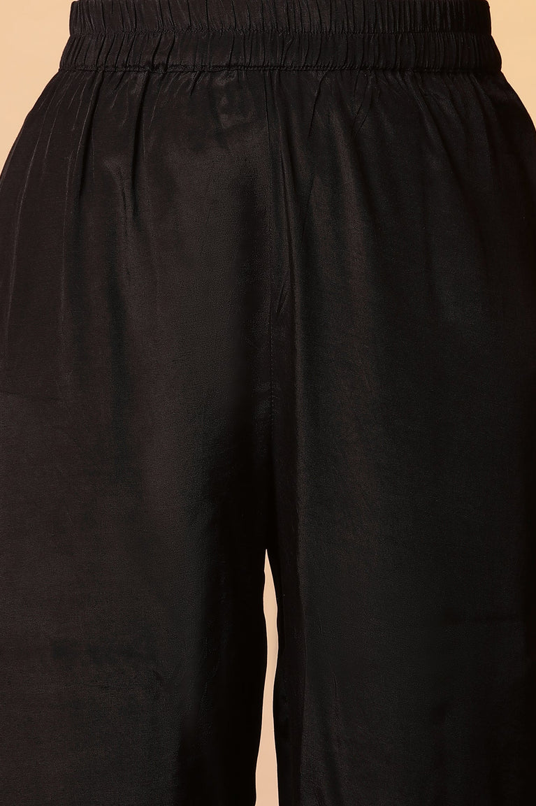 Black solid kurta in round neck a with zari embroidery, paired with flared solid palazzo pants in mid-rise and elasticated waistband.