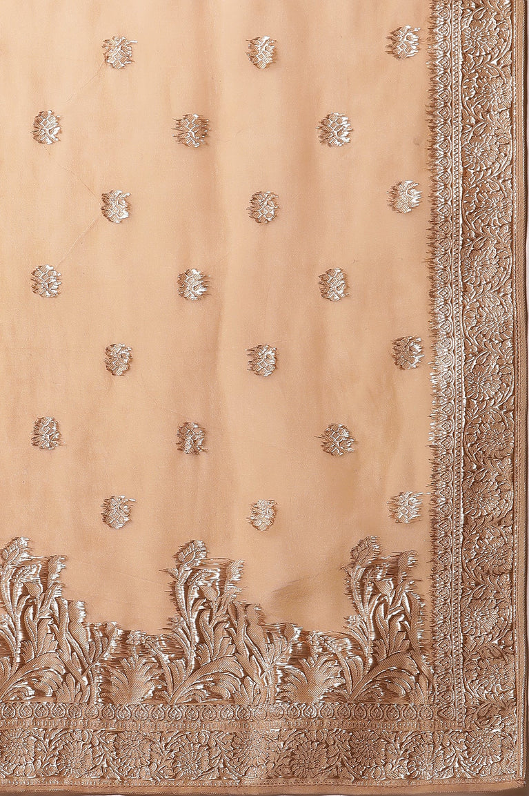 A Straight kurta in exclusively curated texture fabric, adorned with Golden zari embroidery. It is paired with matching bottom and a complimenting jacquard dupatta with beautiful bird motifs.