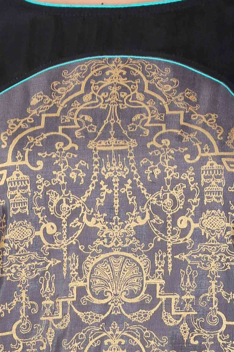Teal A-line kurta with gusset detail, sheer georgette sleeves and a vibrant placement print. This style is perfect for a festive evening. It can be paired with our new exclusive golden chocker neck dupatta and our classic golden tights.