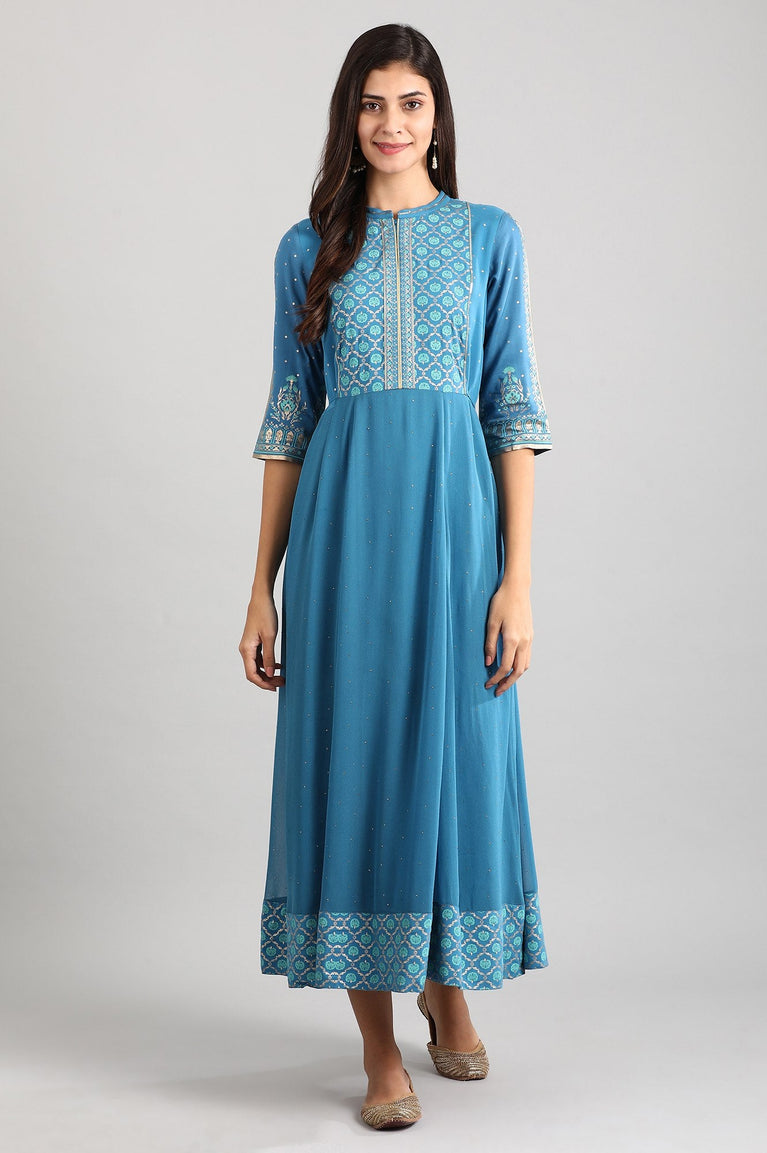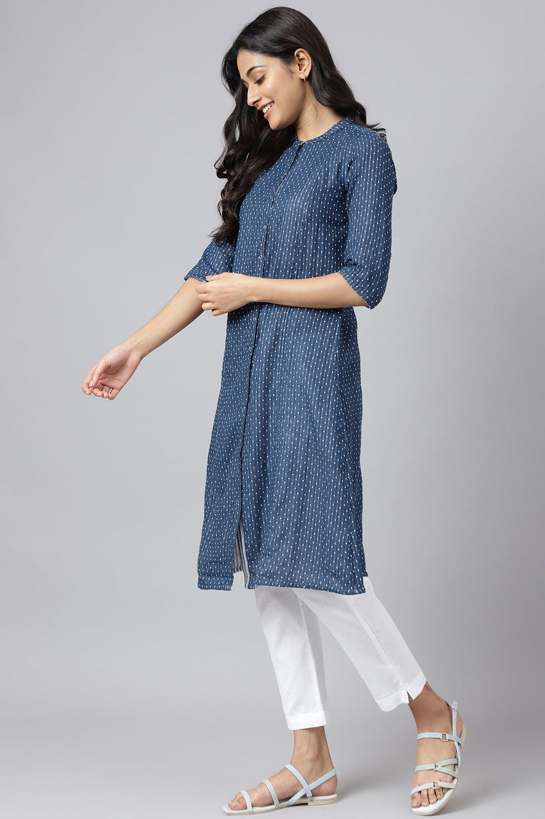 Blue and white round neck 3/4 sleeve kurta with printed detail and open front.