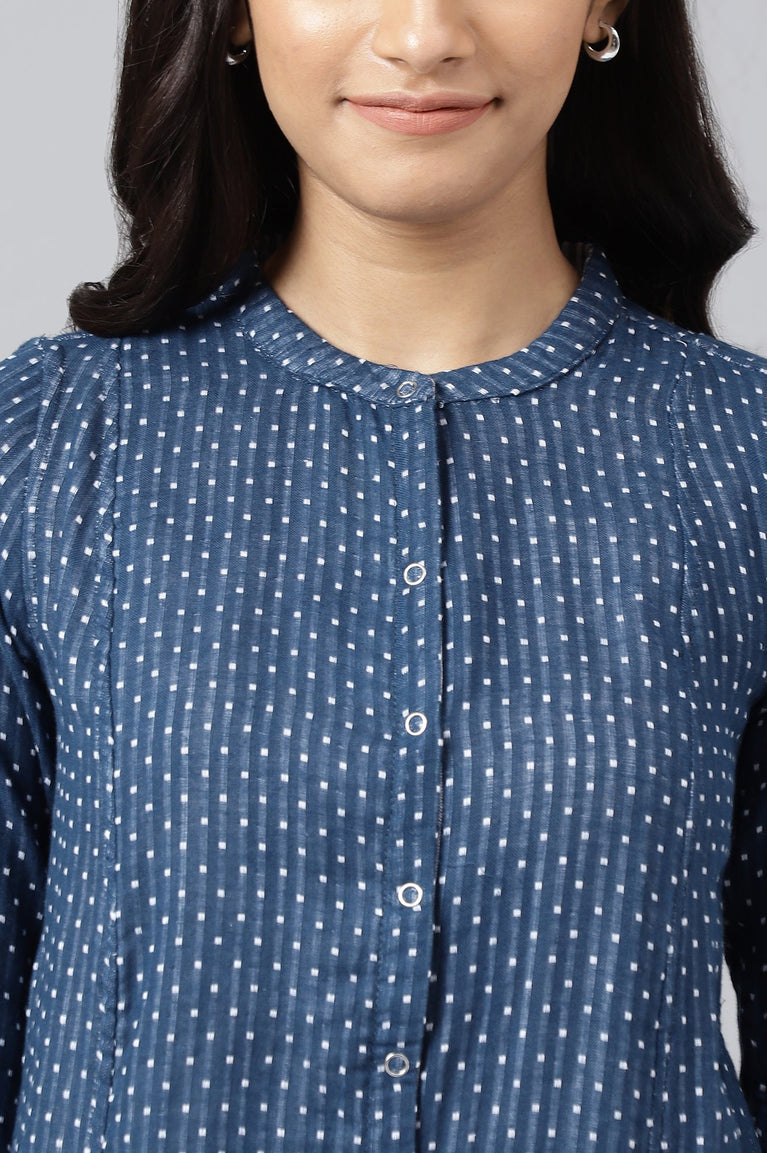 Blue and white shirt collar yarn-dyed kurta with placket detail, roll-up sleeve detail, curved hem and striped pattern.