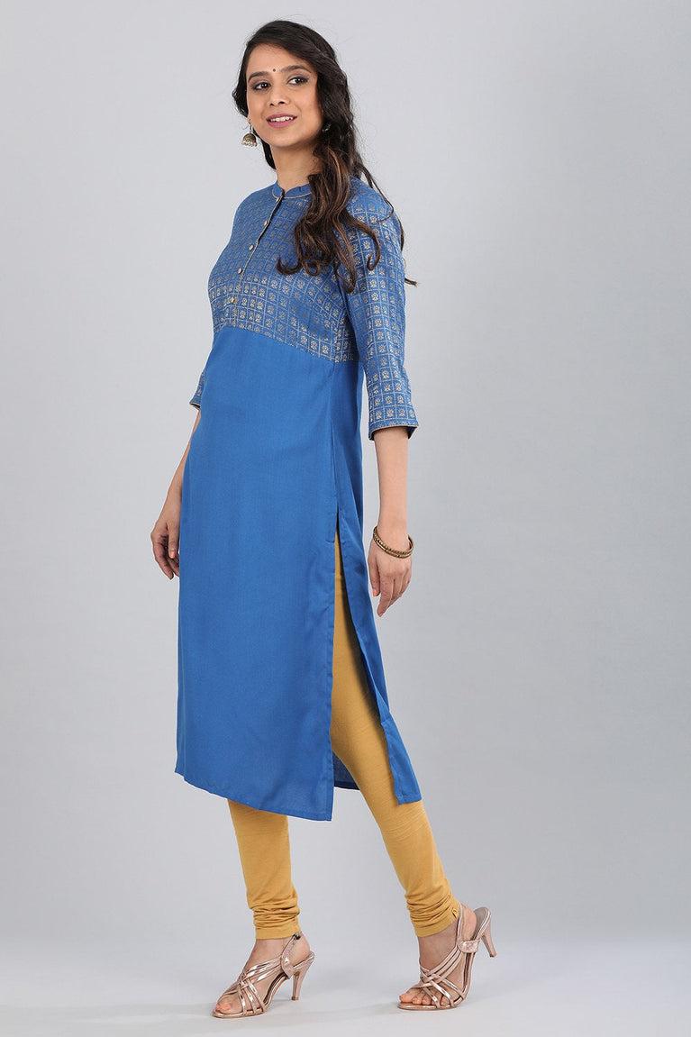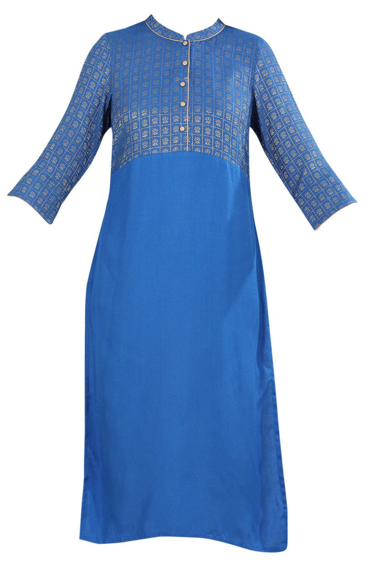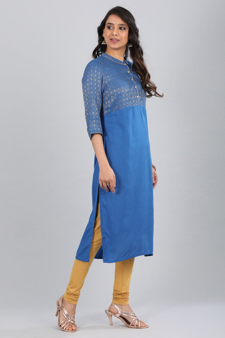 Blue band collar 3/4 sleeve kurta with printed detail and placket on the front.