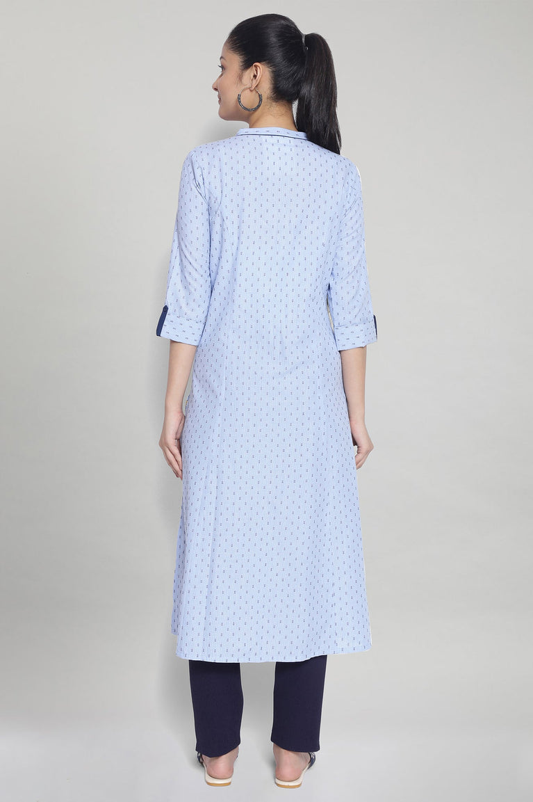 Powder blue band collar with button placket kurta having roll on tab three-fourth sleeve and geometric print detailing all-over.