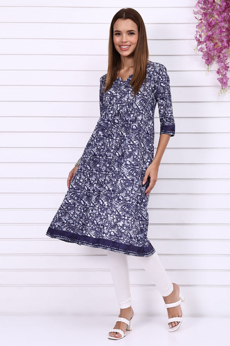 Add a touch of traditional artistry to your everyday wardrobe with this blue batik printed pure cotton straight kurta. Crafted from breathable and lightweight pure cotton, this kurta keeps you comfortable through the day while reflecting effortless style. The classic straight silhouette is both easy to wear and flattering, making it ideal for workwear and casual errands. The hand-inspired batik print in refreshing blue tones adds a rustic yet refined character, while the V neckline and 3/4th sleeves lend a timeless appeal. Perfect for daily wear, this cotton batik straight kurta for women offers a relaxed fit and clean finish that adapts well to both Indian and fusion looks.