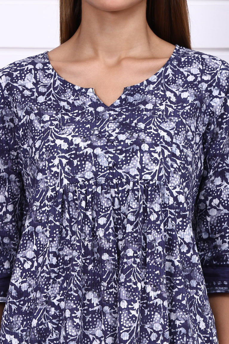 Channel artistic roots with this blue batik printed flared kurta, designed for comfort and visual impact. The all-over batik pattern, rendered in rich blue hues, adds handcrafted charm, while the breathable cotton fabric ensures all-day wearability. The flared silhouette and soft gathers make it a flattering choice for many body types, while the round neckline and 3/4th sleeves keep the look balanced. This blue batik print casual cotton kurta is a go-to option for both workday cool and off-duty charm.