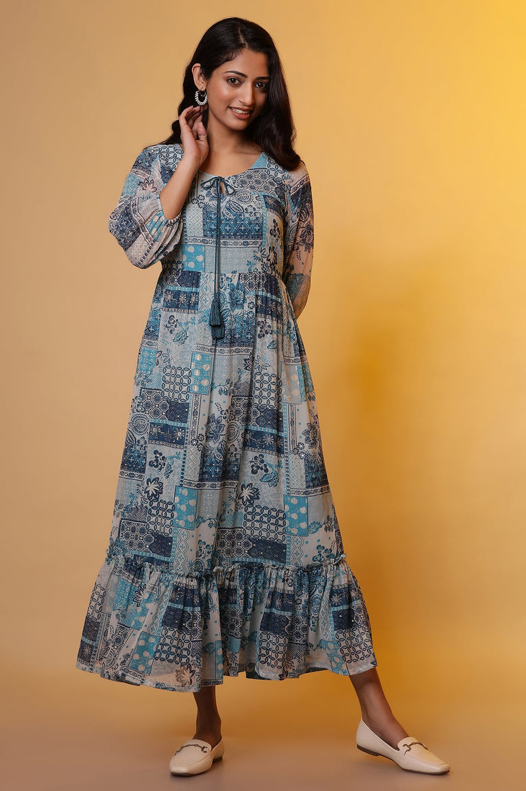 Blue Chiffon Gold Foil Printed LIVA Dress