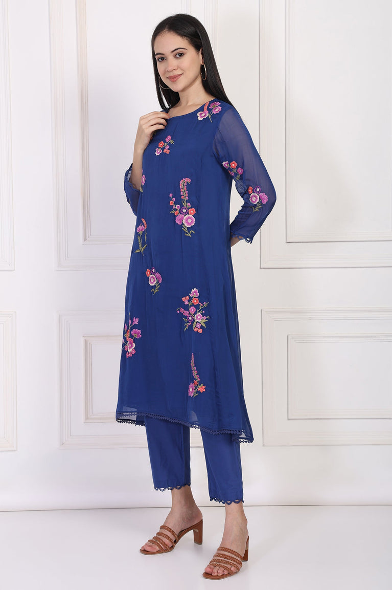 Blue Embroidered A-Line Organza Kurta with Straight Pant and Dupatta Set