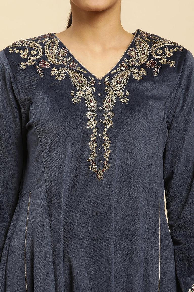 Blue Embroidered Flared Velvet Kurta