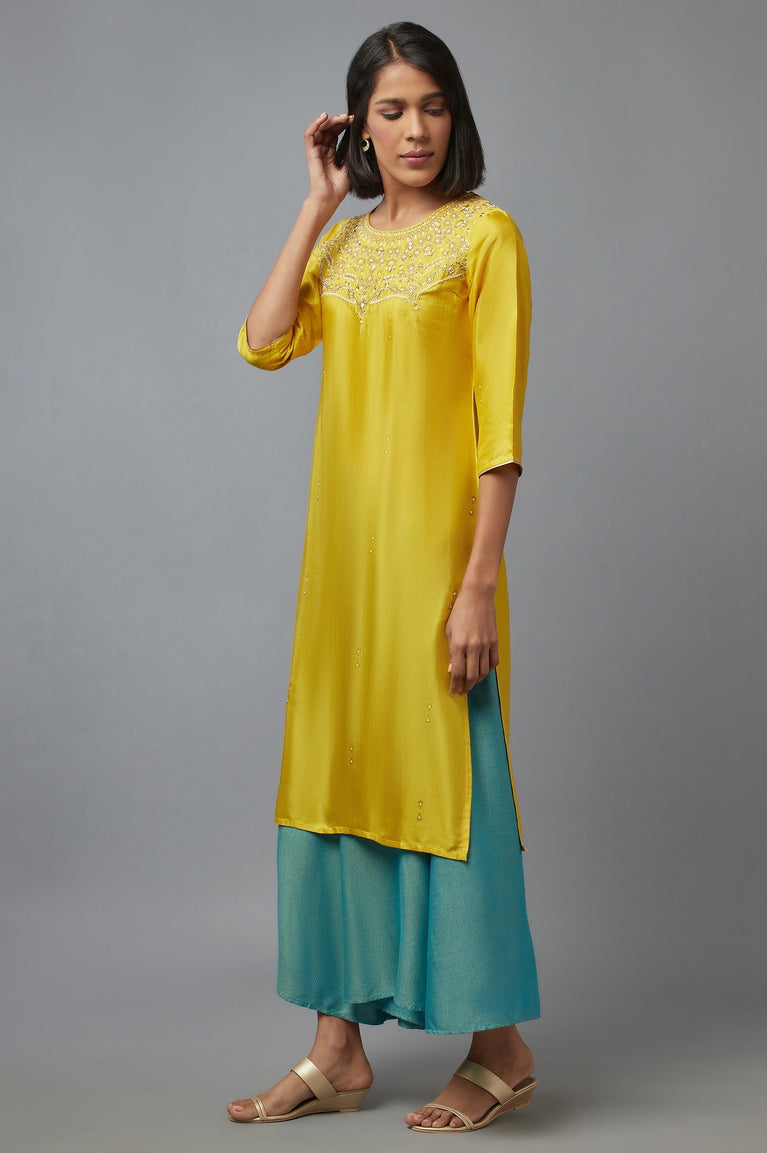 Elevate your ethnic wardrobe with this stunning blue kurta crafted from modal satin. The mandarin neckline adds a touch of sophistication, while the three-quarter sleeves offer comfort and style. The straight silhouette flatters various body types, making it a versatile choice for casual occasions. The kurta features a beautiful floral print, adding a feminine charm to the overall design. Made from 100% viscose using a woven construction technique, this kurta ensures breathability and durability. Perfect for women who appreciate the blend of traditional and contemporary fashion, this ethnic piece is a must-have for your casual wear collection. Pair it with stylish sandals to complete the look, exuding effortless elegance. Versatile and timeless, this outfit is perfect for making a statement at any occasion, day or night.