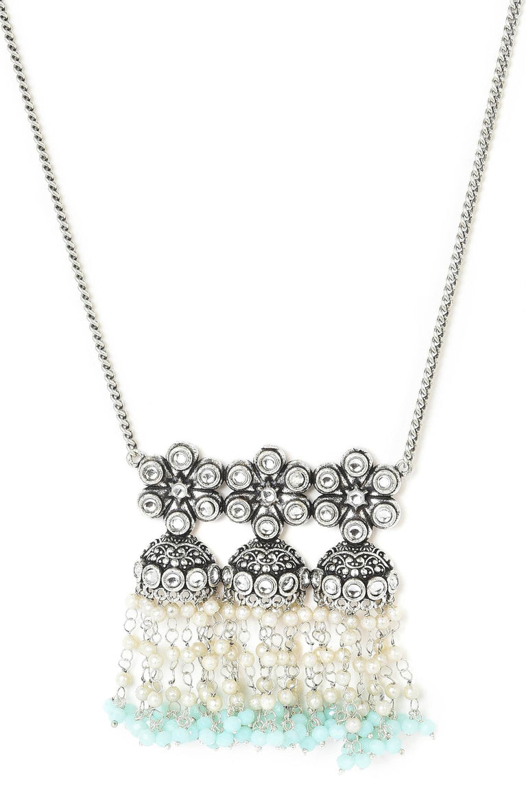 Traditional Silver Oxidised Lariat Necklace Set With Faux Kundan And Blue Crsytal Beads Detailing