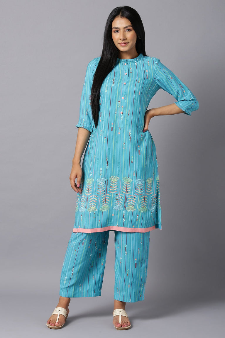 Get A Statement Look In This Fusion kurta Set By W. The Set Includes Aqua Blue Floral Printed Straight kurta In Keyhole Neckline And Features Thread Embroidery. It Is Coordinated With Matching Floral Printed Parallel Pants In Mid-Rise With Partially Elasticated Waistband And Multicoloured Chiffon Dupatta.