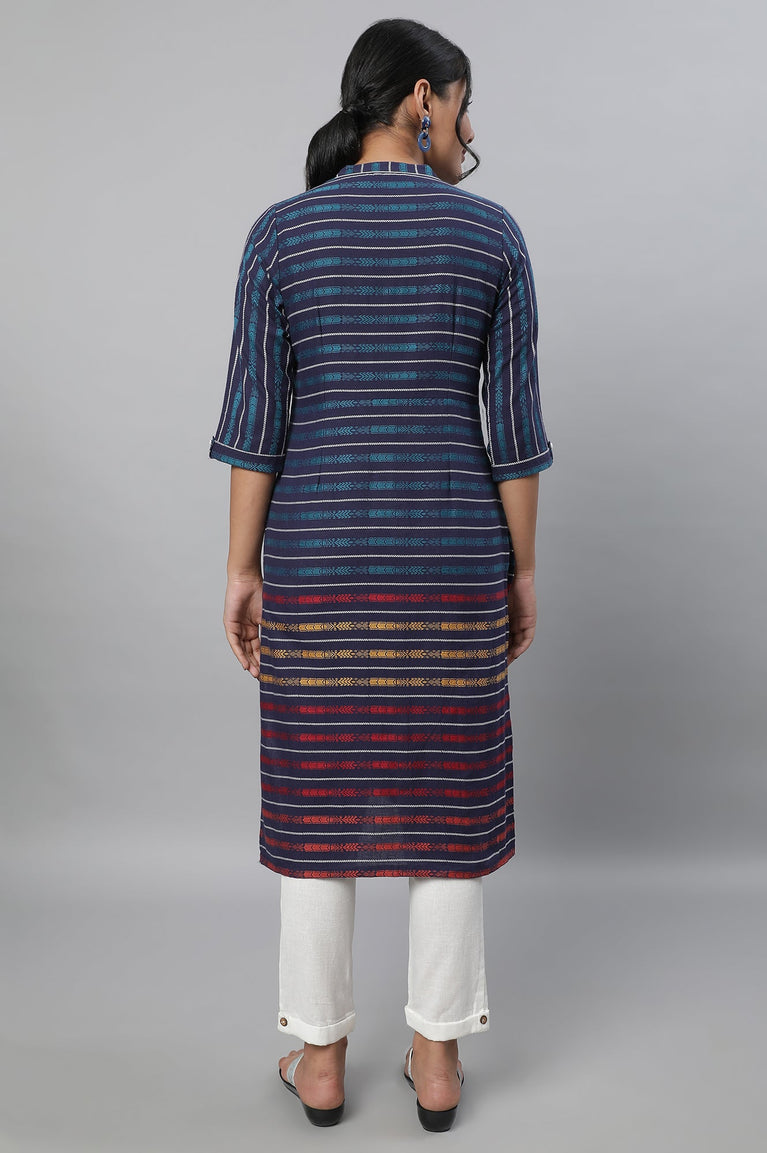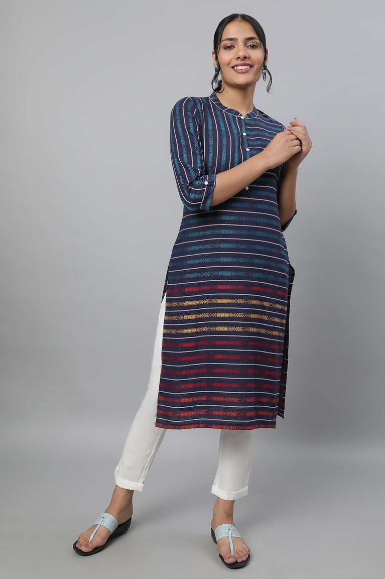 Tweak your ethnic ensembles with this stunning navy blue two-piece set. It's assembled together in breathable rayon fabric and consists of a printed centre panel straight kurta with side slits and a complimenting printed flared culottes.