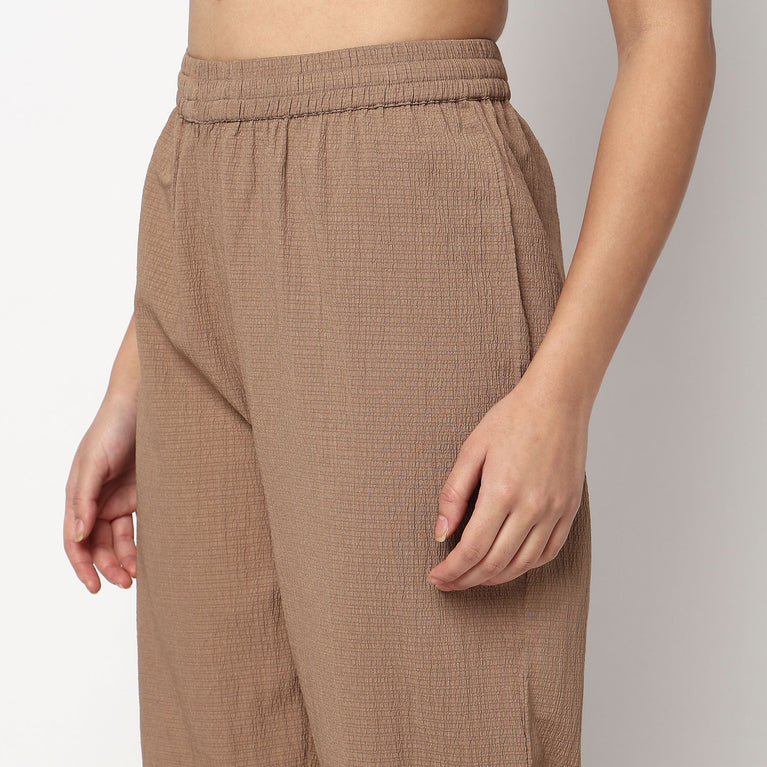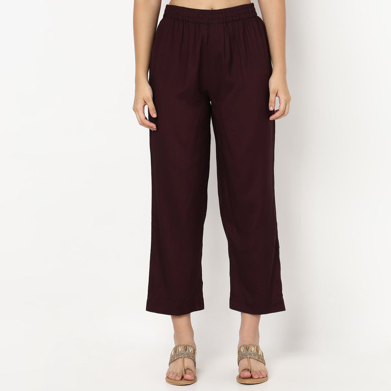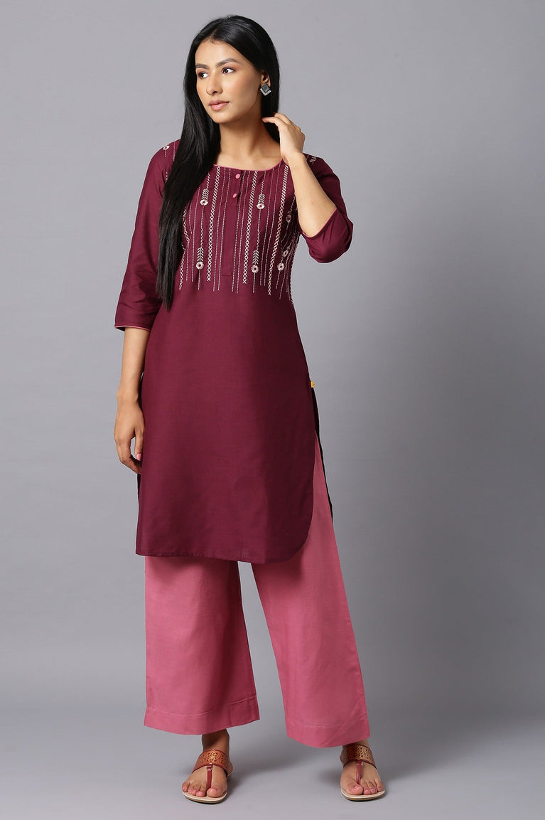 Your Evening Date Plan Is Sorted With This Chic And Elegant kurta Set. The Set Includes Solid Purple kurta With Thread Embroidery On Yoke And Pink Straight Palazzo In High-Rise With Elasticated Waistband.
