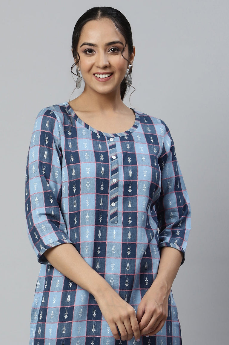 Blue Yarn Dyed Cotton Blend Straight Kurta and Palazzo Set