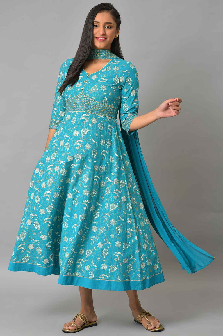 Elegant yet stylish, this light festive kurta set is a must-have for summer wardrobe. Get the chic look in this ethnic set by Aurelia. The set includes blue printed kurta in straight silhouette and it is paired with white flared palazzo. The set also comes with a white dupatta.