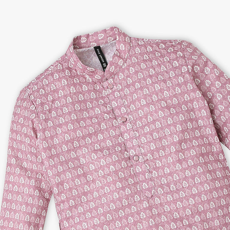 These printed pattern kurta with pant set has mandarin collar and full sleeve. Made from polyester cotton, your kid's feel comfortable wearing the product.