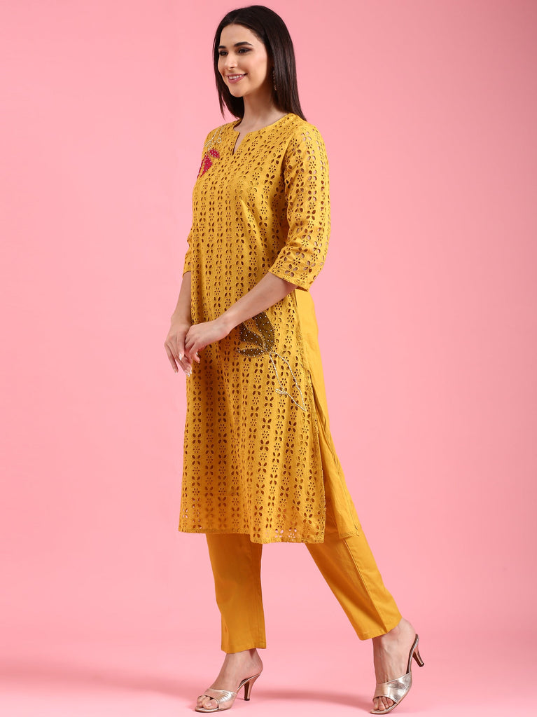 This Exquisite Set Is Crafted From Pure Cotton And Patterned With Luxurious Ethnic Motifs. It Features A Deep V-Neck, ¾ Length Sleeves, A Gorgeous Knee-Length Straight Cut, And A Finely Detailed Hemline. The Trousers And Dupatta Provide A Perfect Finishing Touch For A Timelessly Glamorous Ensemble.