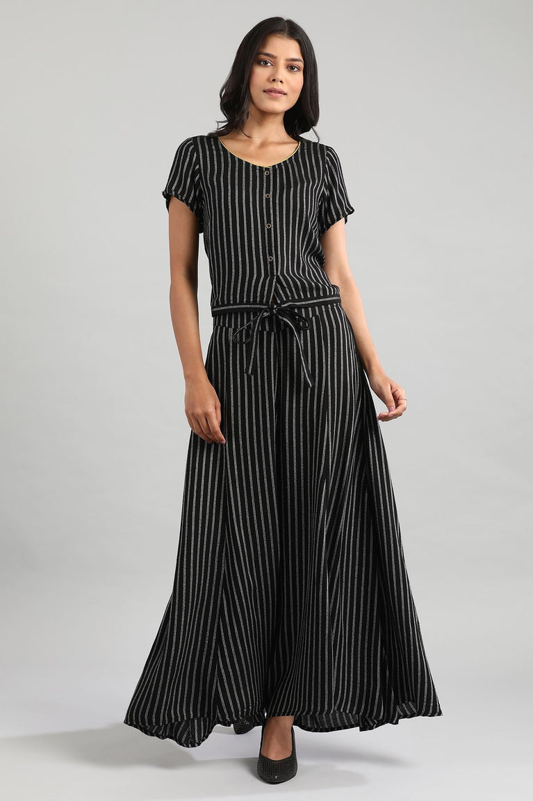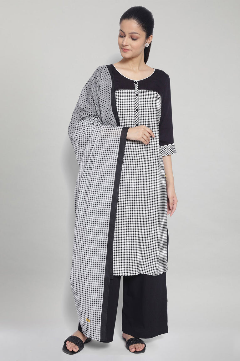 Black round neck kurta having three-fourth sleeve and check print. The kurta comes with a black straight fit palazzo with elasticated waistband and black printed dupatta.